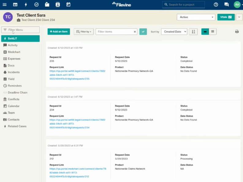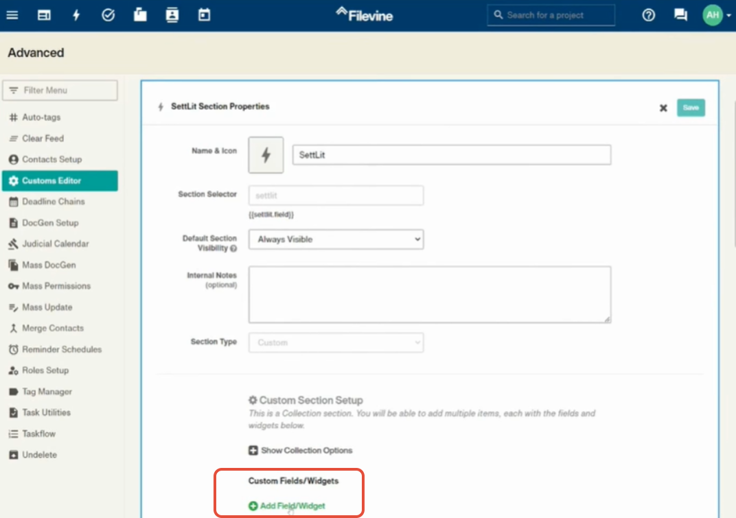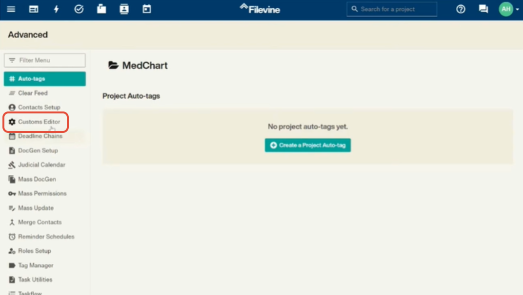1. Log into Filevine account and select a project. Keep in mind that only the Admin user will be able to make the following configuration on the Filevine account.