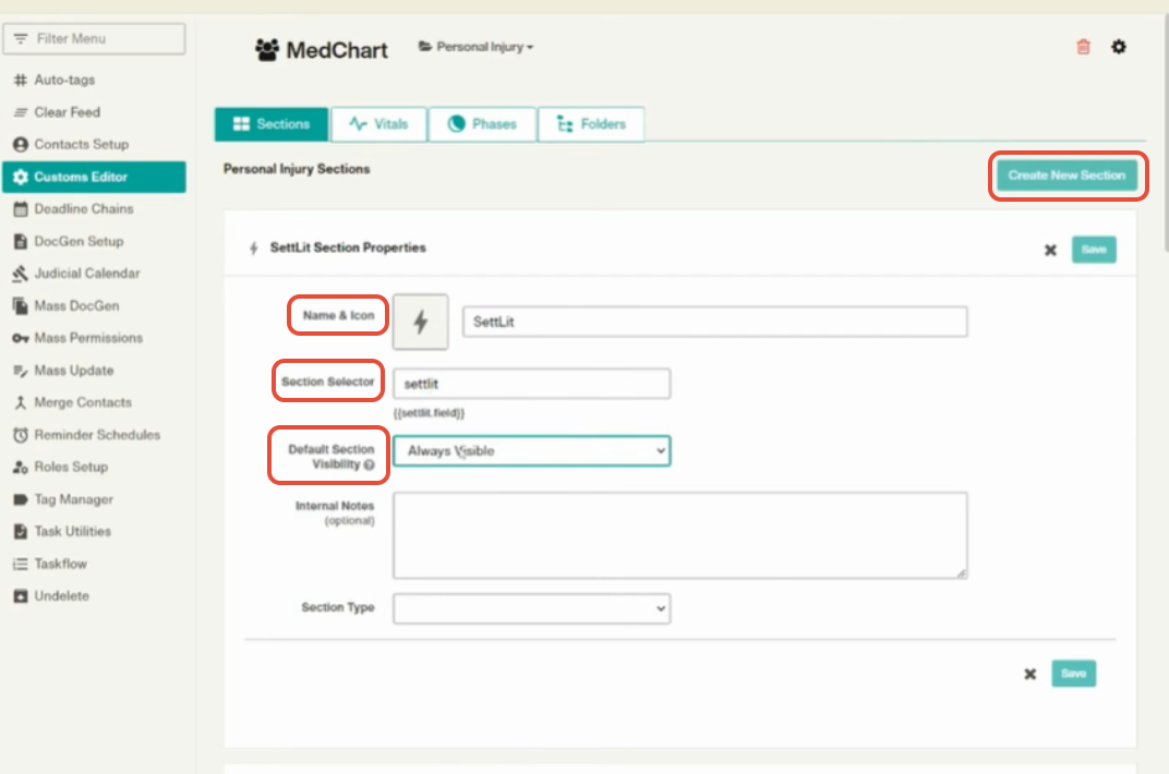3. Select Create New Section where you will confirm the Collection box is checked. Input the SettLiT information as shown. Select Save.