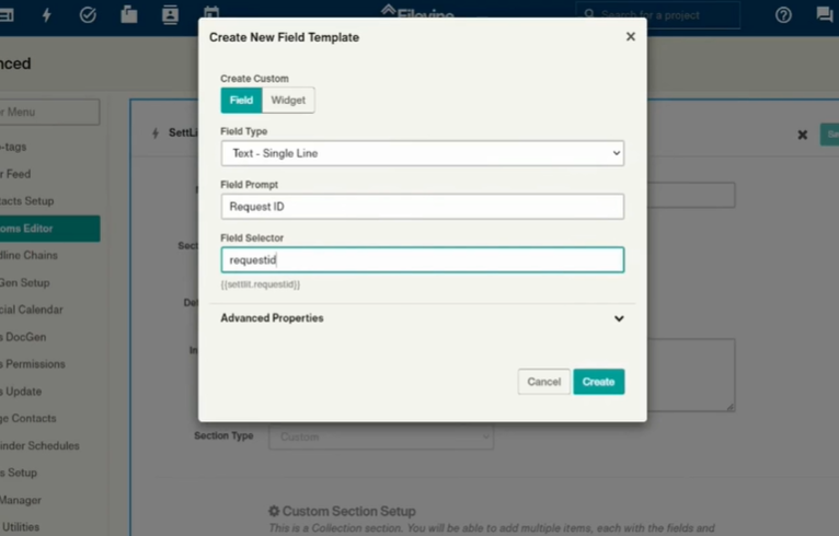 - In the drop down select Text-Single Line, Field Prompt as Request ID and Field Selector as "requestid". Select Create.