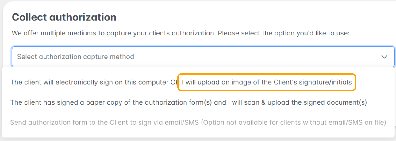 With authority granted to you by your client to affix their signature, you may select the first option where the image of the client's signature will be uploaded.