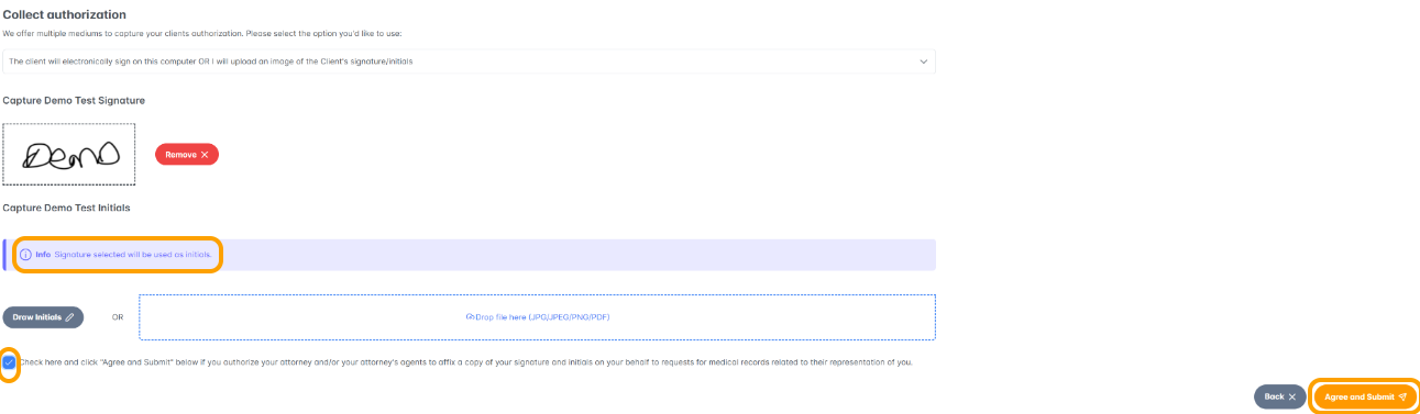 Step 4: You will see the signature populated under the Capture section. Note: The signature is used for the initials section as well.