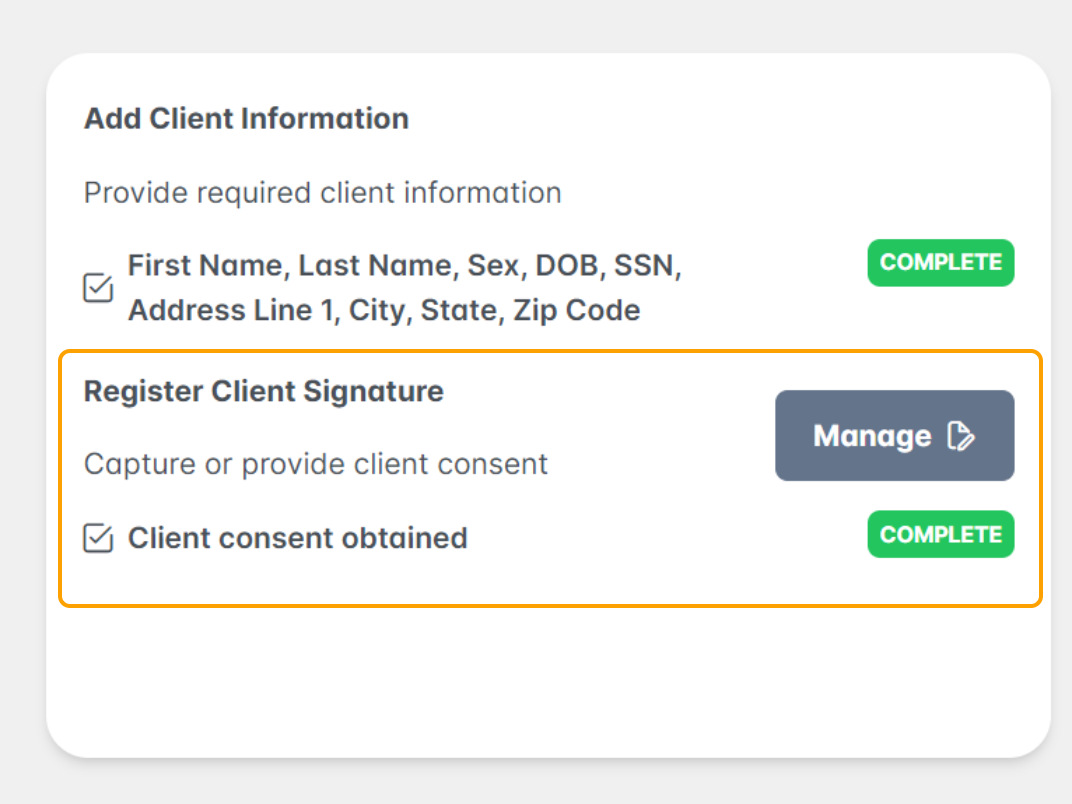 The following steps will walk you through how to register a client's signature and therefore, complete their profile in order to place a data query.