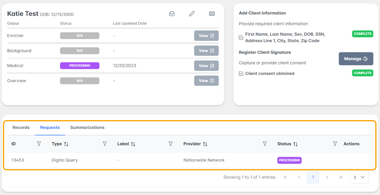 Step 3: You will be brought back to the Client dashboard where you will see the digital query has been placed and processing.