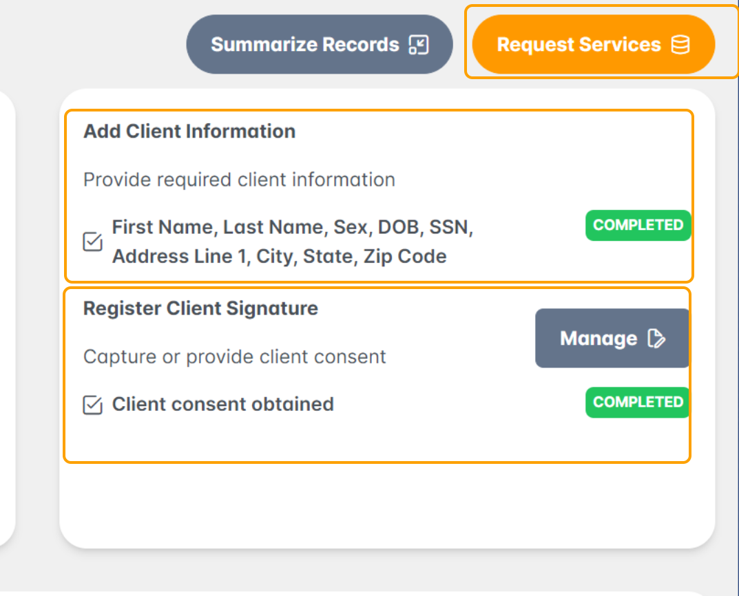 Step 1: Once the signature flow is completed, you will be taken back to the client dashboard screen. Ensure that both the Add Client Information and Register Client Signature are both Complete as shown below. Next, select Request Services.