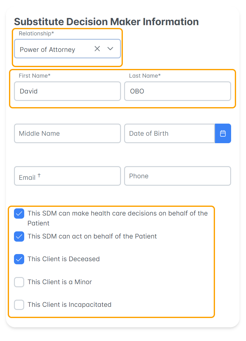 - OBO/SDM: Substitute Decision Maker or on behalf of cases, responsible for signing on behalf of client