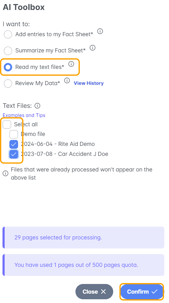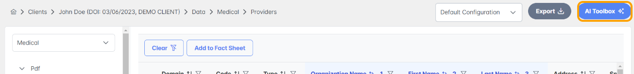 - AI will review the data and create categories on the Plaintiff Fact Sheet based on the Motor Vehicle Accident use case (first iteration of the fact sheet).