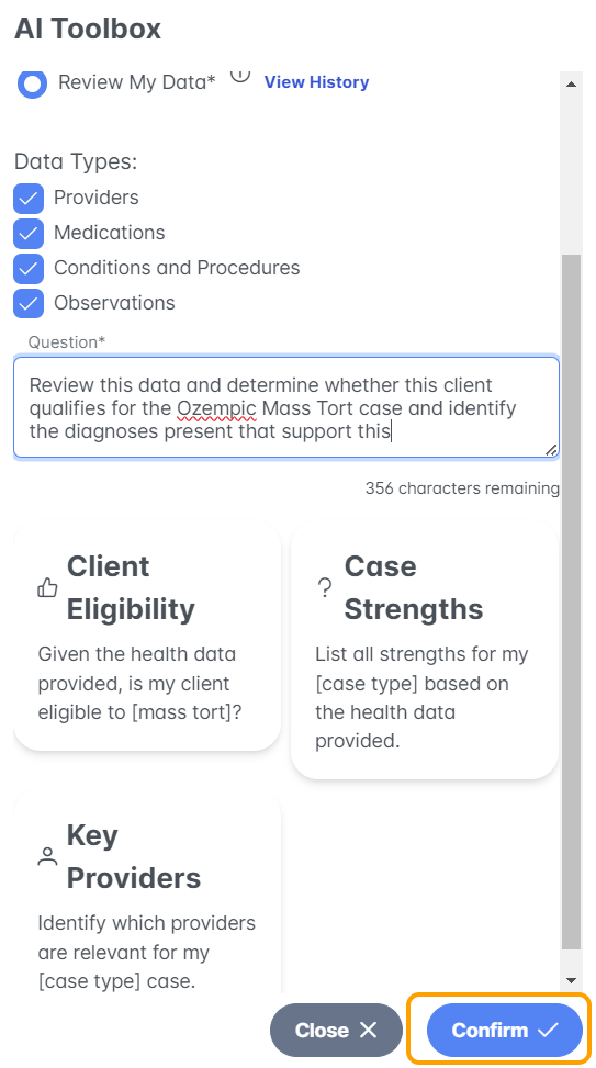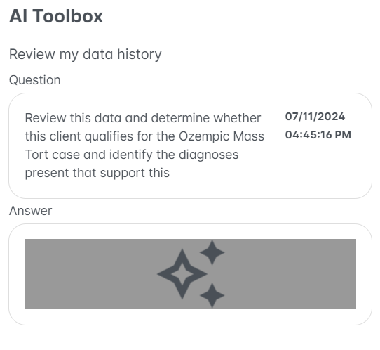 - Ask the AI a question. An example is: "Review this data and determine whether this client qualifies for the Ozempic Mass Tort case and identify the diagnoses present that support this."
